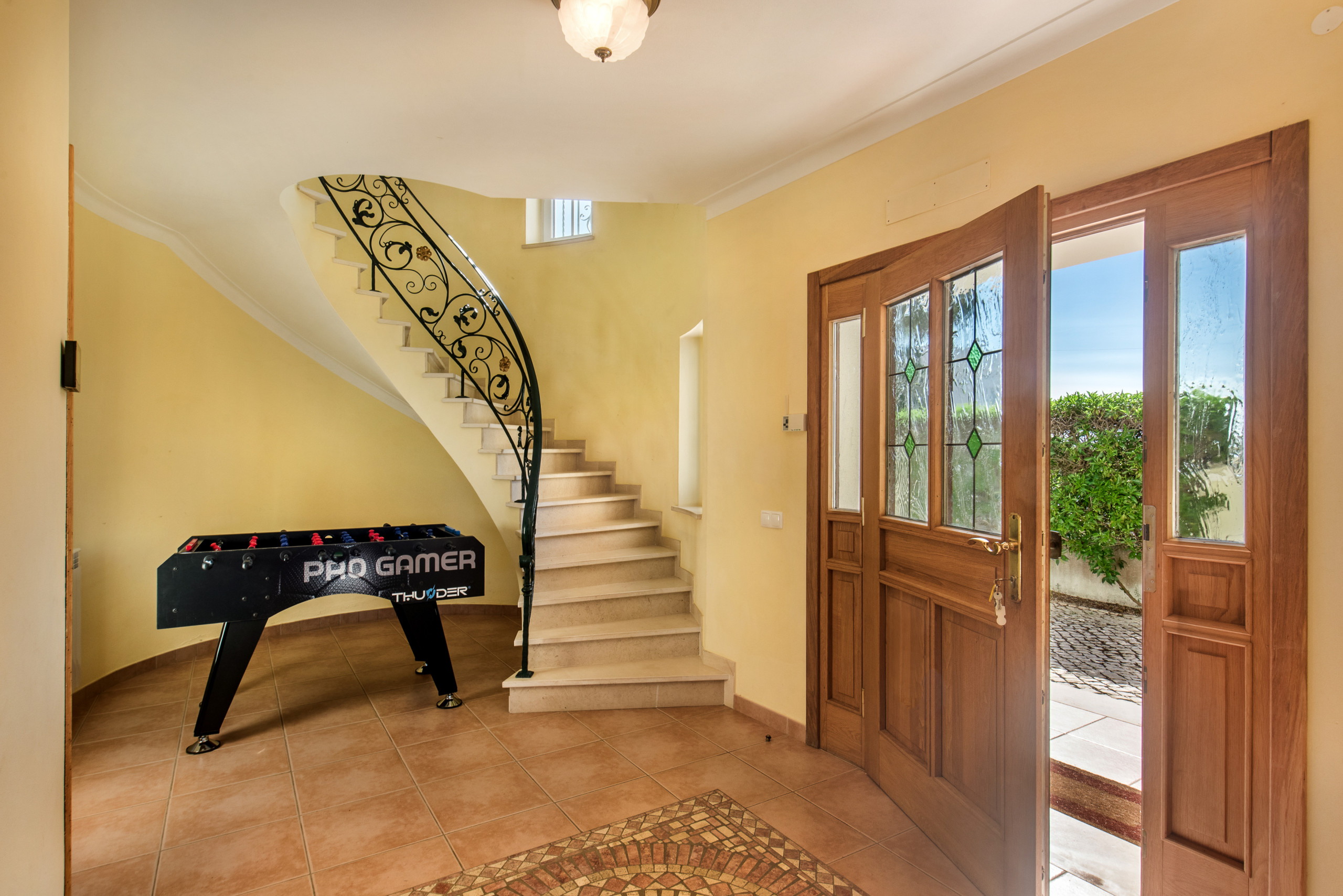 Upon entering into an impressive hallway with a beautiful wrought iron spiral staircase this leads into the spacious living-dining area equipped with two comfortable sofas, chairs, fireplace, Cable TV and a dining table with seating for eight people.