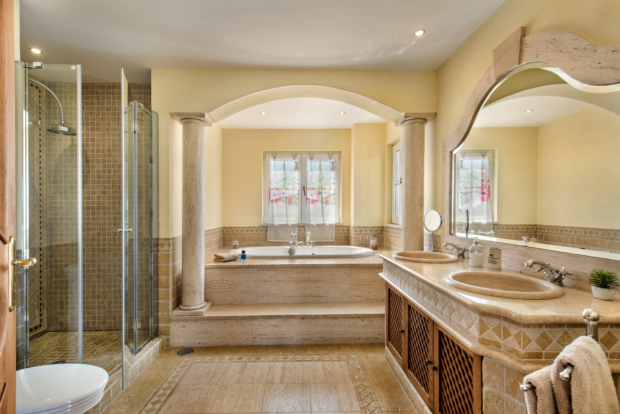 The Master bedroom has fitted wardrobes and a glamorous en suite marble bathroom with Jacuzzi bath, separate rain shower, basin with mirror. The twin bedroom has an en suite shower room and fitted wardrobe.