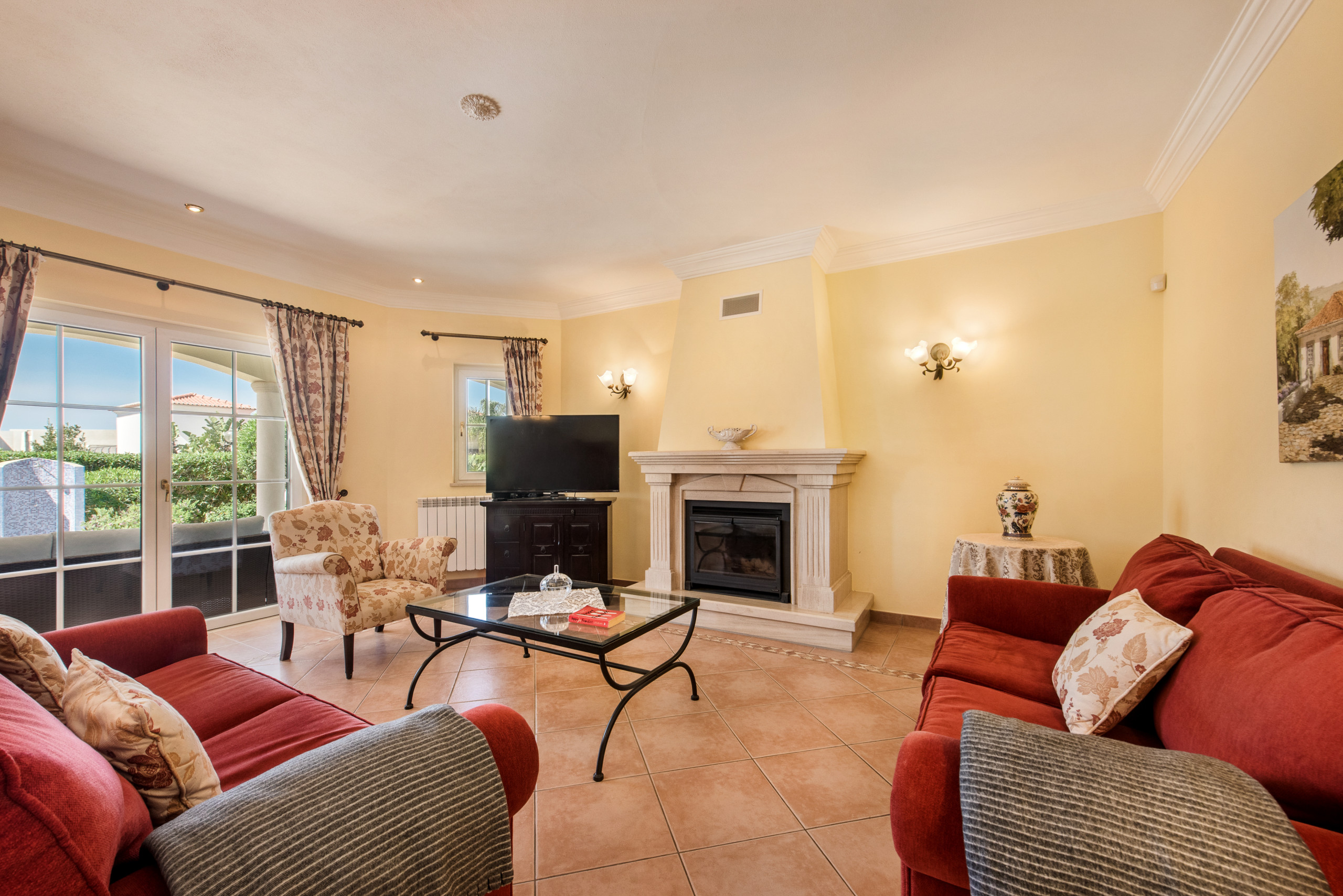 Beyond the dining room is the comfortable living room featuring a TV that has access to many international channels and log burner, perfect for the cooler months.